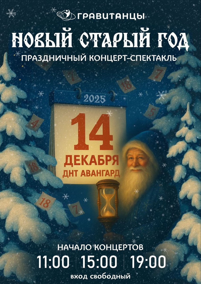 ❄️❄️❄️❄️❄️❄️❄️❄️❄️❄️ Представляем наш новогодний концерт-спектакль 🔔 «Новый старый год» ☃️ Вас ждет новогодняя, сказочная история в которой примут участие все наши группы — и хобби и профи! И, как всегда, на наших концертах вас ждет масса приятных сюрпризов: · 🧚♀️ Аниматоры в фойе (чтобы юные артисты не скучали перед выходом на сцену!) · 📸 Профессиональные фото с выступления · 🌟 Красивая новогодняя фотозона · 📽 Видеозапись всего концерта и каждого номера отдельно · 🎁 Презент и грамота каждому ученику «Гравитанцев» · 🎤 Сказочные ведущие · 🤩 Бесплатный вход в зрительный зал Запланируйте провести этот день вместе с нами🎆 Будем ждать вас ❤️
