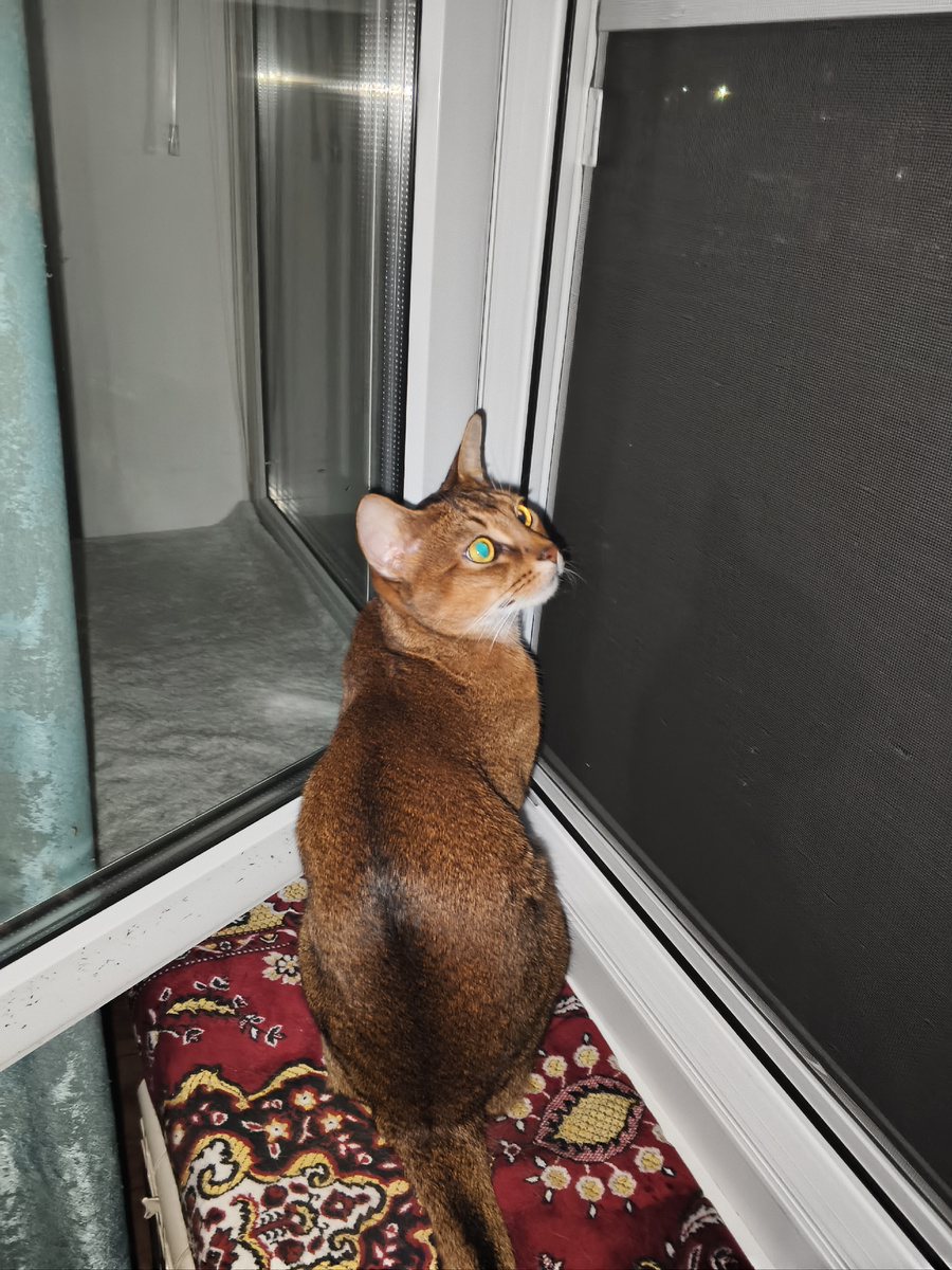 Сейчас Мавр не хочет идти на улицу, все таки сыро, дело к зиме. Иногда тоскливо поглядывает в окошко... И тогда я его открываю, он сидит минут 5, и потом ему становится зябко. Подышал и хватит, говорю я и захлопываю окно.