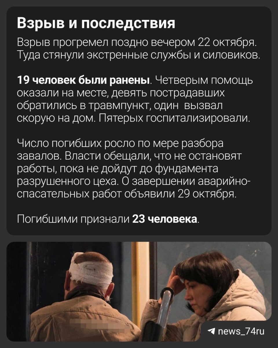 Похоронены не все. С момента взрыва на заводе в Копейске прошел месяц ЧП случилось вечером 22 октября, и аварийно-восстановительные работы с участием МЧС и спасателей продолжались неделю. Официально погибшими признали 23 человека. Похоронили пока меньше половины из них. Процедуры опознания продолжаются до сих пор. Мы составили хронику случившегося в карточках⬆️ 🟥Что с заводом и уголовным делом. В первые дни после ЧП — на период аварийно-восстановительных работ — производство на заводе было остановлено, но со временем сотрудники вернулись на свои места. Предприятие снова работает. В Следственном комитете продолжают расследовать уголовное дело о нарушении требований промышленной безопасности. Материалы переданы в Москву. Мы направили запрос в СКР с просьбой прояснить, предъявлены ли кому-то обвинения. Ответ будет опубликован после получения. За нарушение требований промышленной безопасности опасных производственных объектов, повлекшее смерть нескольких человек (ч. 3 ст. 217 УК РФ)