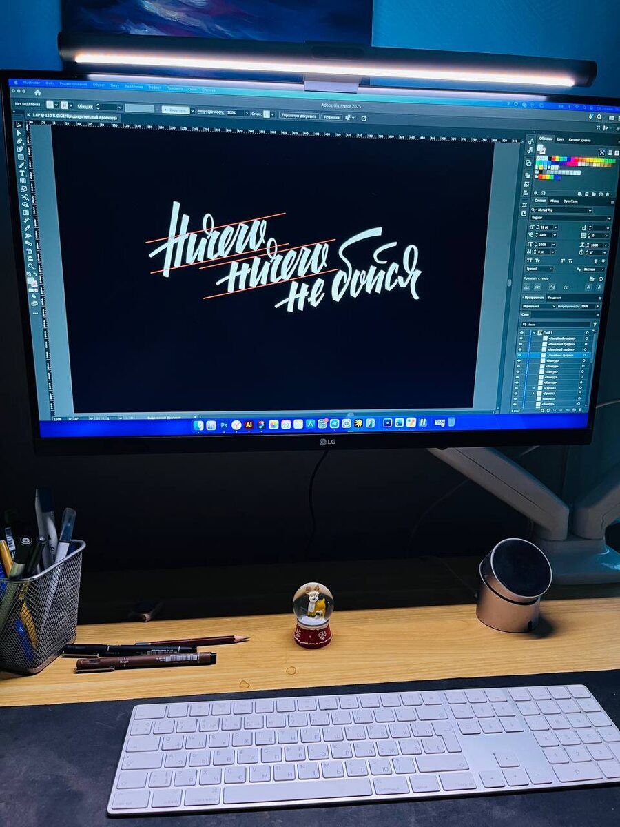 В ответ на пост Кстати, про леттеринг. Работаю над цифровой версией, как я понял, понравившейся всем надписи. Под монитором снежный шарик пытается создать новогоднюю атмосферу.