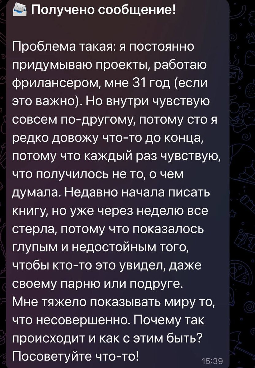 Здравствуйте! Многие творческие и талантливые люди сталкиваются с этим внутренним конфликтом, когда внешне вы кажетесь уверенным творческим человеком, но внутри живет страх, что любое проявление вашего процесса будет недостаточно хорошим. Очень важно заметить: потребность в совершенстве почти всегда это попытка защититься от стыда. Если работа будет идеальной, то никто не сможет сказать, что она недостаточно хороша. Никто не сможет задеть самое чувствительное место: «я старалась, а этого все равно не хватило». Поэтому внутренний критик (https://t.me/psymostpropsy/159) предлагает жесткую стратегию: «Не показывай. Удали. Еще раз переделай. Не позорься или вообще не начинай». Но парадокс в том, что живое творчество никогда не бывает завершенно-совершенным. И дело не только в написании книги. На месте книги может быть что угодно - от рабочего проекта до картины. Творчество рождается через черновики, через пробы и ошибки, через поиск. Его сила не в идеальности, а в подлинности. Это именн