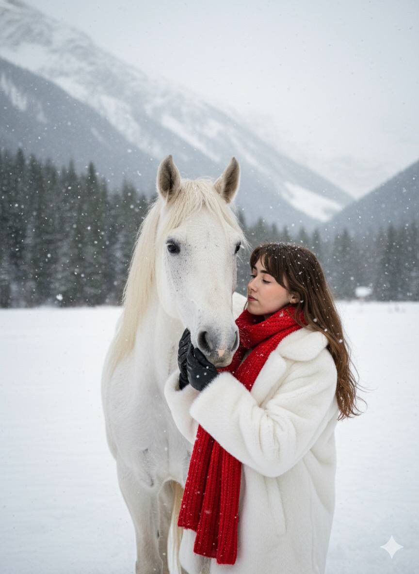 Уже очень скоро наступит время зимней сказки... ❄ Мы собрали для вас промпты (и нет, это не всем надоевший зимний коллаж), чтобы вы могли прочувствовать новогоднюю атмосферу уже сейчас! Для всех генераций нужен Gemini и фото в хорошем качестве 🫡 1⃣ Промпт для фото с лошадью: Ultra-high-resolution 8K photorealistic vertical 9:16 winter portrait of a person (based on my uploaded photo) standing close beside a majestic white horse in a snowy mountain valley. The framing is tall and elegant: the person and the horse fill the center vertically, with the snowy mountains and fir trees rising softly in the background. The person wears a luxurious white coat with soft fur texture, a bright red scarf, and black gloves. Hair is natural, slightly wavy, gently flowing in the cold air. The white horse stands very close, its head leaning toward the person, creating a calm, intimate connection. Snowflakes fall throughout the vertical frame, drifting in front of the camera and catching natural dayl