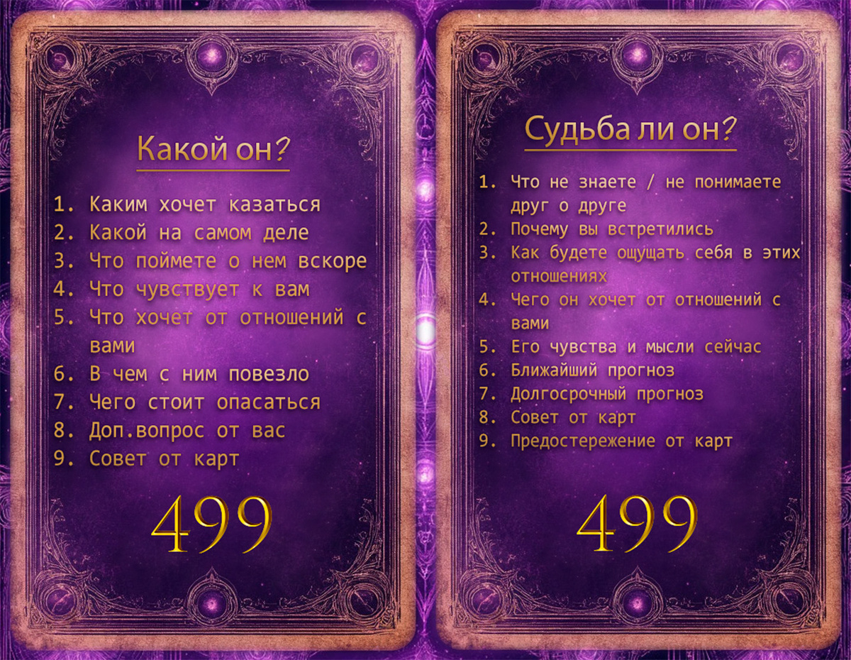 Расклад общий и носит развлекательный характер. Вы можете обратиться ко мне лично через Telegram - https://t.me/kometa_neowise. В предлагаемых раскладах вы можете заменить вопросы на более актуальные для вас.