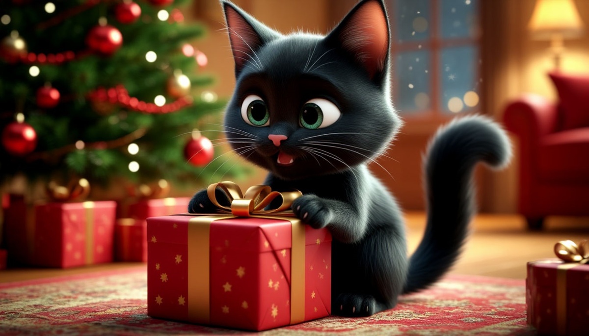 Новогодние обои кот и его подарок.