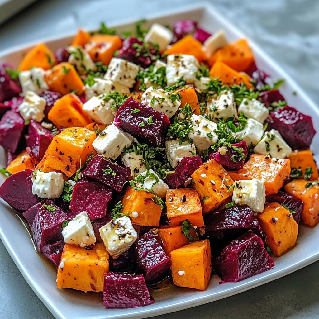 (Яркий, полезный и невероятно вкусный) Этот салат — настоящее буйство красок и вкусов. Сладость карамелизированных в духовке корнеплодов идеально балансируется соленой фетой и освежающей йогуртовой заправкой с лимонной кислинкой. Он прекрасен и как легкий ужин, и как красивый гарнир. Для этого рецепта важно качественно запечь овощи, чтобы они стали мягкими, но сохранили форму.