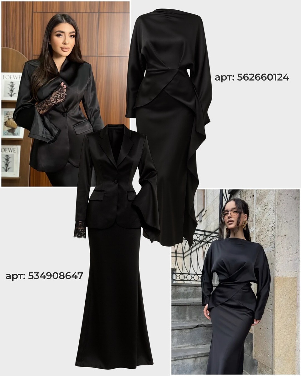 Вечерняя мода сегодня — это смесь скульптурных линий, мягких фактур, драматичных форм и максимальной женственности. Каждая вещь в этой подборке — это яркое дизайнерское решение, не требующее дополнительных украшений. Такие образы создают эффект «дорого и со вкусом» благодаря продуманной архитектуре кроя, необычным драпировкам и благородным оттенкам. Представляю вам подробный, большой и красиво оформленный разбор всех моделей с фотографий — строго по порядку, с акцентом на каждую деталь и обязательными советами стилиста. Первая подборка — Чёрная архитектура стиля Это платье — настоящая архитектура в мире вечерней моды. ● Материал: плотный сатин с матовым блеском, который не подчеркивает лишнее, но красиво формирует силуэт. ● Верх: мягкая линия плеч с эффектом лёгкого напуска создаёт объем и визуально делает фигуру более хрупкой. ● Талия: асимметричная драпировка собирается в сторону, создавая красивый «перелив» ткани и делая талию тоньше. ● Низ: прямой, вытягивающий силуэт с мягким ест