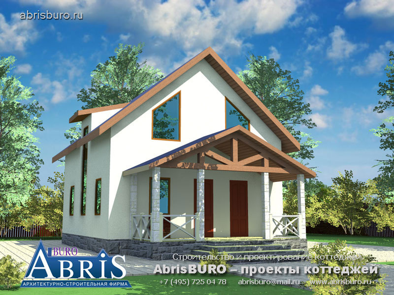 К050-100 Проект двухэтажного небольшого мансардного коттеджа с большим крыльцом