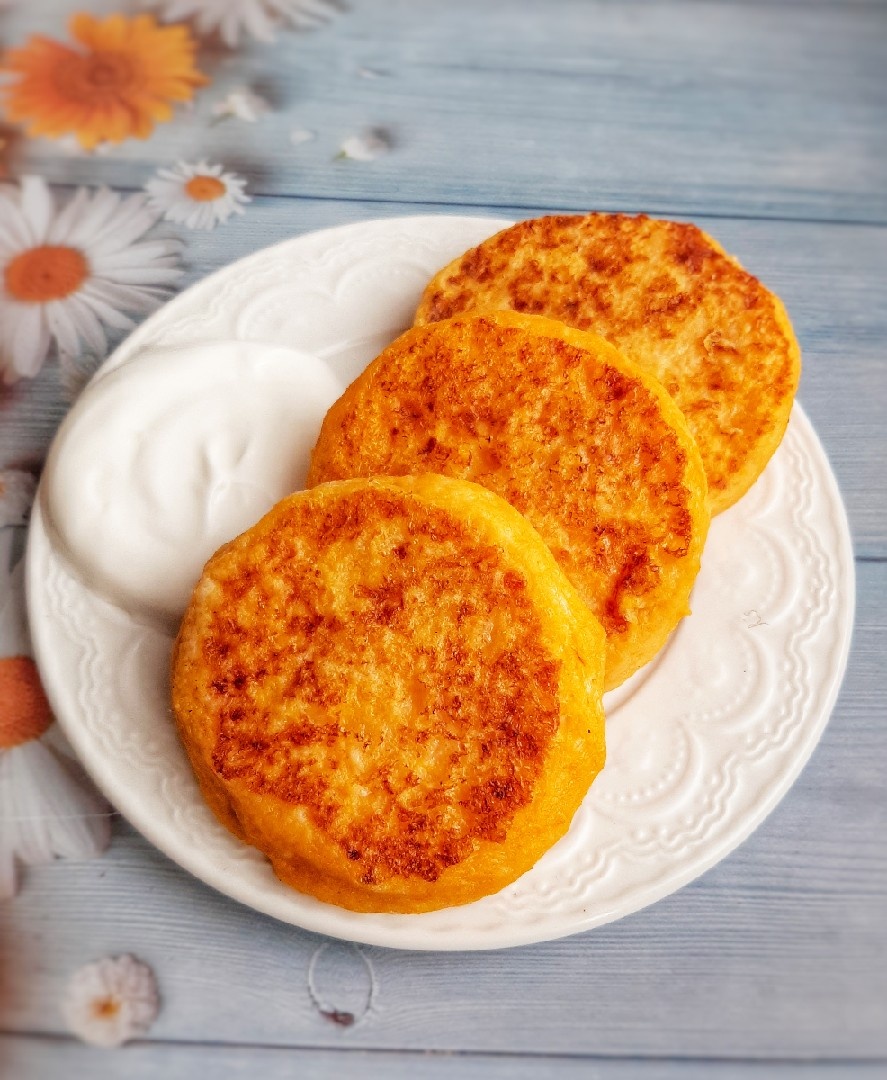 Пропорции: • тыква - 200 г • творог 9% - 360 г • яйцо - 1 шт • сахар - 1 ст.л • мука - 1 ст.л • манка - 1 ст.л + для панировки Способ приготовления: Соединить творог, яйцо, сахар, муку и манку. Тыкву натереть на мелкой терке и добавить к творожной массе. Хорошо перемешать и скатать шарики одинакового размера. Обвалять в манке и обжарить на сковороде с двух сторон до золотистой корочки. Затем накрыть крышкой и готовить на слабом огне 10 минут.