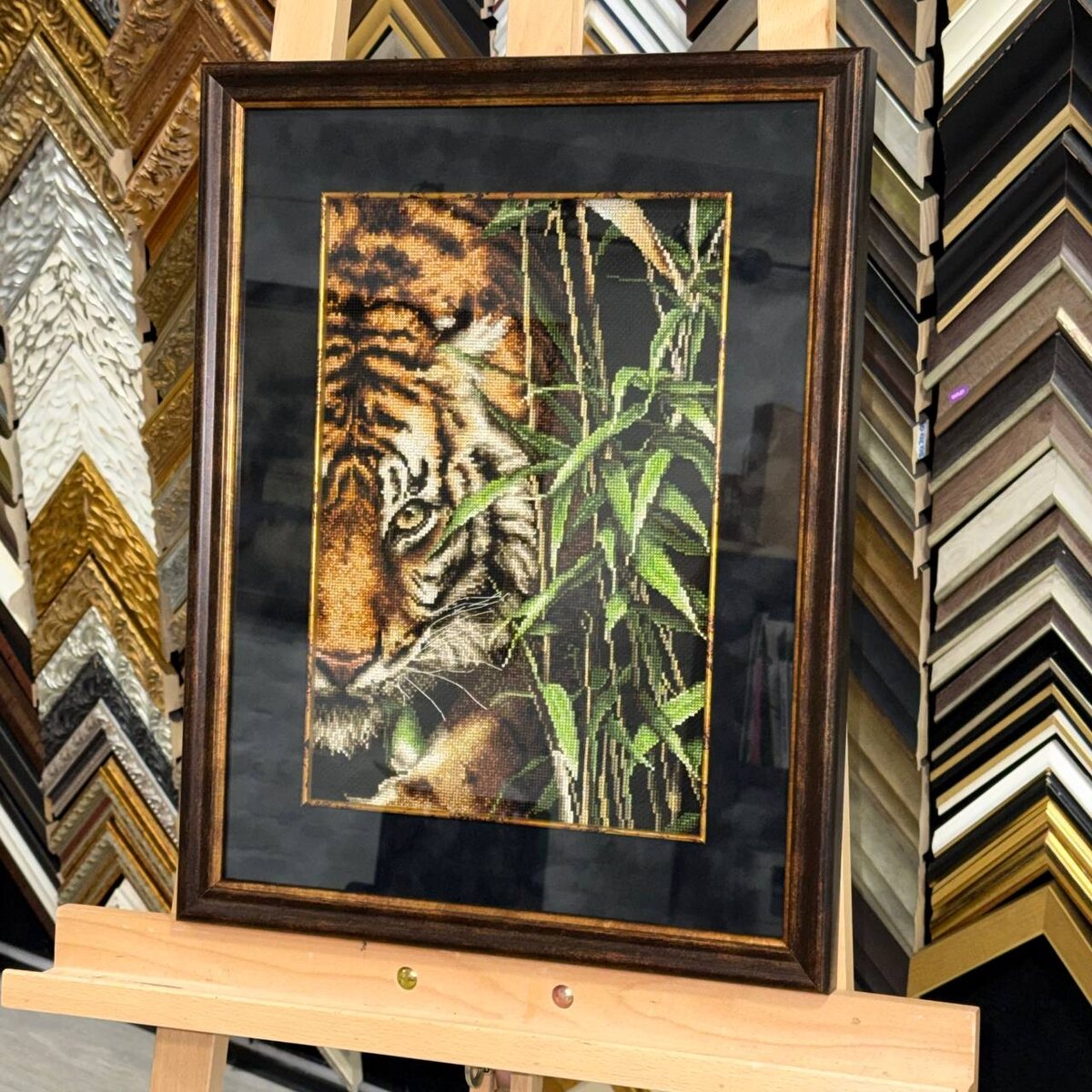 🎨 Подобрать оформление к вышивке на чёрной канве — настоящий квест. Тёмный фон требует ответственного подхода: малейшая ошибка — и теряется либо глубина, либо главный акцент. 🐅 Вот отличный пример — вышивка с тигром, крадущимся сквозь бамбуковые заросли. С заказчицей мы перебрали, кажется, миллион вариантов паспарту и багета. 🍃 Зелёное паспарту — вся глубина мгновенно пропадает, взгляд перескакивает на растительность. 🤎 Бежевое, в тон шерсти тигра — и он… просто теряется, растворяясь в фоне. А вот чёрное бархатное паспарту, подобранное в тон канвы, сразу расставило всё по местам: 📏 объём вернулся, появилась перспектива, тигр “выступил” вперёд и заиграл во всей своей мощи, а зелень стала аккуратным композиционным дополнением. 🖼️ Кант в этой работе выполняет одновременно декоративную и функциональную роль, помогая композиции «зазвучать» целостно. Тем более, он идеально сочетается с кантом на багете — прямое попадание 10 из 10, объединяющее всё оформление в единую гармоничную композ