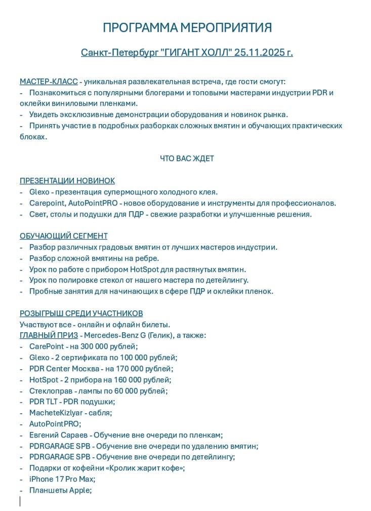 🎉 ⚡️БИЛЕТЫ на МАСТЕР-КЛАСС по PDR ⚡️ 🎉 ❗️ Санкт- Петербург "ГИГАНТ ХОЛЛ" 25.11.2025 г.❗️ 🔥 Купить билет по ссылке 🔥 → https://pdrgarage-spb.timepad.ru/event/3673062/ ❗️Среди участников будут разыгрываться призы от Партнеров: • Carepoint • Glexo • PDR Center Москва • AutoPointPRO • HotSpot • Стеклоправ • PDR TLT - PDR подушки https://vk.com/pdrtlt • MacheteKizlyar https://t.me/MacheteKizlyar • Обучение вне очереди от Евгения Сараева https://t.me/saraev_e • Обучение вне очереди от PDRGARAGE SPB • Подарки от кофейни «Кролик жарит кофе» ❗️ГЛАВНЫЕ СПИКЕРЫ • Сараев Евгений - один из лучших мастеров по пленкам, участник и судья международных соревнований по оклейке, сертифицированный тренер ; • Сергей Уфимский - один из лучших мастеров в Мире по удалению градовых вмятин; • Сергей Французов - конструктор лучших приборов для удаления растянутых вмятин в России; • Егоров Максим - инструктор нашей школы PDRGARAGE SPB; • Жальский Константин - имеет собственные школы по PDR за рубежом. 🔥