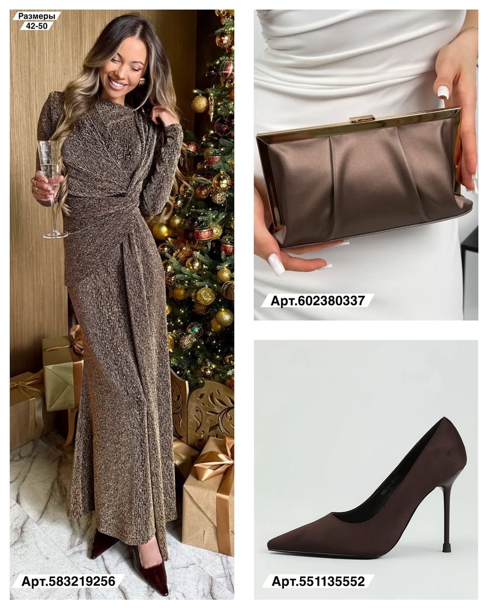 Праздничные вечерние образы — это всегда немного магии. Правильно подобранное платье, изящный клатч, идеальные туфли и сияние аксессуаров способны превратить обычный вечер в особенный. Сегодня мы разберём два выразительных комплекта, каждый из которых создан для эффектного появления. Первый образ — мягкое золото, тёплое сияние, бархатное настроение праздничной ночи. Второй — драматичный чёрный с металлическим серебром, создающий энергичный, роскошный силуэт женщины, уверенной в себе. Разбор — строго по порядку, с артикулами, подробным описанием и профессиональными советами стилиста. ОБРАЗ №1 — Золотистая роскошь и глубокий шоколад Это платье — абсолютная концентрация праздничного настроения. Это платье любит спокойные аксессуары. Не стоит добавлять крупные украшения. Достаточно маленьких серёг-гвоздиков или аккуратного браслета. Идеальное сочетание с золотистым платьем. Такой клатч лучше держать в руке, как вечерный аксессуар, — это подчёркивает его элегантность. Обувь, которая заве