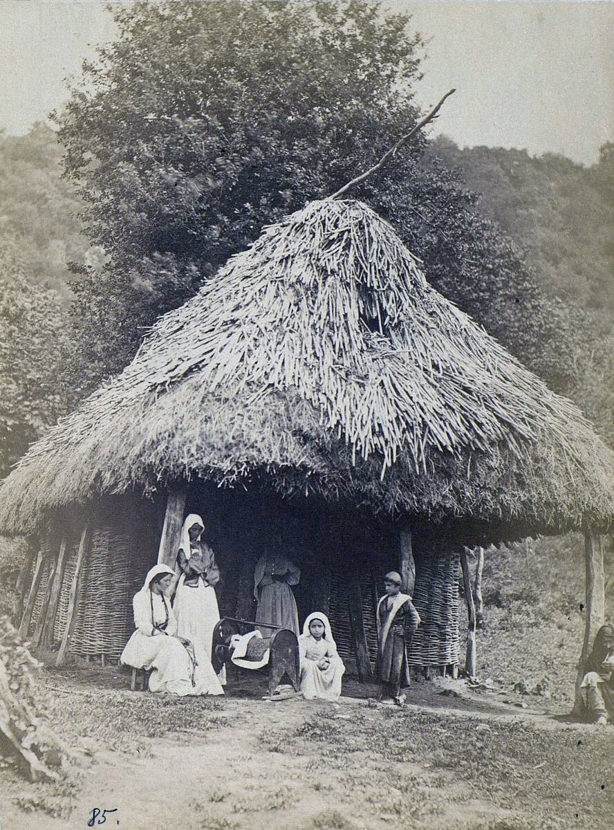 Абхазские женщины и дети с колыбелью у сакли, 1890-е гг.