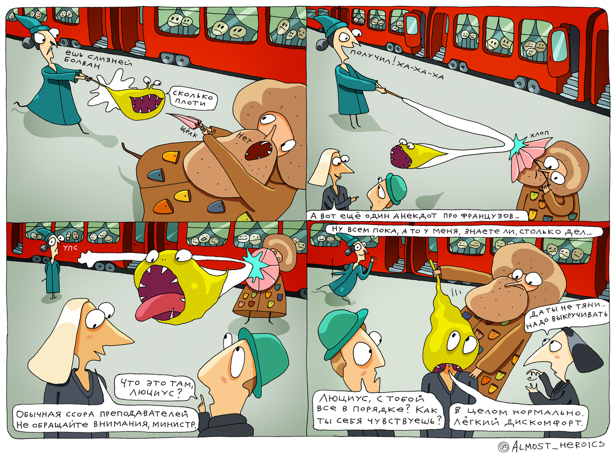А я спокойно так отвечаю: "А чего это вы, профессор, дерётесь". И сам её легонечко локтем пихнул. А когда она вылезла, значит, из-под вагона и отряхнулась, то снова бежит ко мне. Только уже палочку свою волшебную выхватила и в меня целит. Ну и я свой зонт вынимаю. Я же тоже волшебник и всё такое. Щас, думаю, как наколдую ей разных штук.
