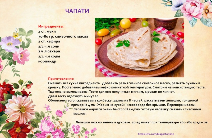 🥞 ЧАПАТИ 🌀 Ингредиенты: 2 ст. муки 70-80 гр. сливочного масла 1 ст. кефира 1/2 ч.л соли 2 ч.л сахара 1/4 ч.л соды кориандр 🌀 Приготовление: Смешать все сухие ингредиенты. Добавить размягченное сливочное масло, размять руками в крошку. Постепенно добавляем кефир комнатной температуры. Смотрим на консистенцию теста. Тщательно вымешиваем. Тесто должно получиться мягким, к рукам не липнет. Даем тесту отдохнуть минут 20. Обминаем тесто, скатываем в колбаску, делим на 8 частей, раскатываем лепешки, толщиной примерно 4 мм. Жарим на сухой (!) сковороде без крышки. Переворачиваем. Лепешки жарятся очень быстро! Каждую готовую лепешку смазать сливочным маслом. Лепешки можно запечь в духовке. 10-15 минут при температуре 160-180 градусов.