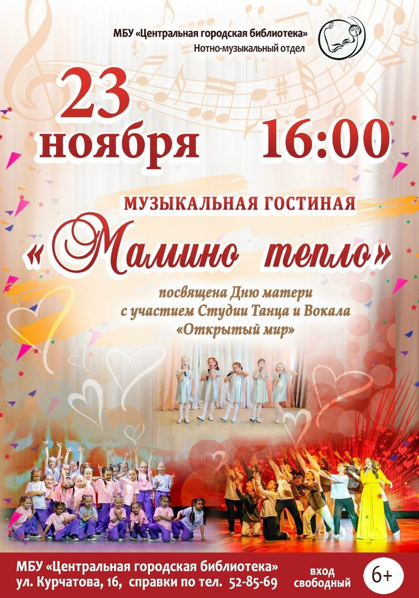 Северчан приглашают на музыкальную гостиную, посвященную Дню матери Для вас выступят талантливые обучающиеся эстетического центра «Открытый мир». Юные дарования вложат в свои выступления частицу души, чтобы выразить безмерную любовь и благодарность самым главным в нашей жизни женщинам. #СеверскАфиша