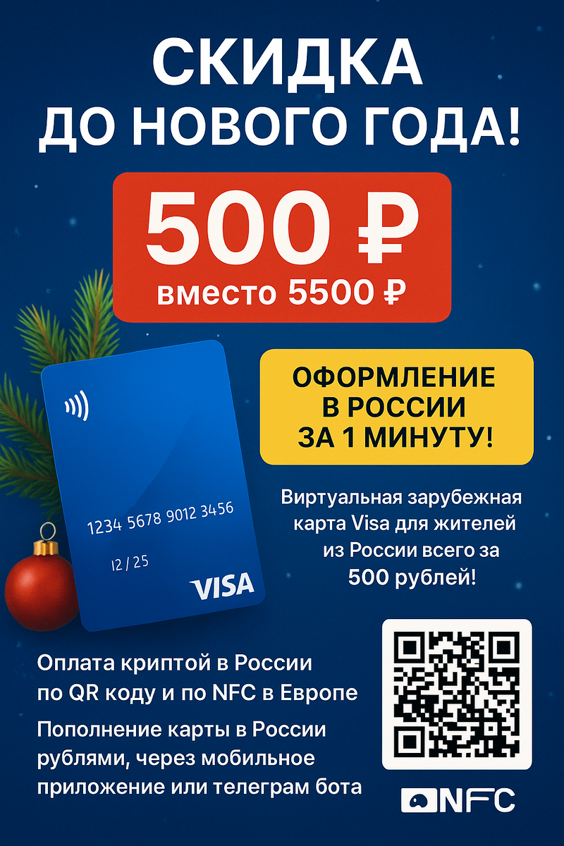 Представьте: вы сидите дома в России, открываете телефон и буквально за 60 секунд получаете полноценную зарубежную банковскую карту Visa, которой можно оплатить абсолютно всё — и в российских магазинах, и за границей. Никаких походов в банк, никаких документов, никаких ожиданий. Только до Нового года это стоит всего 500 рублей. После 1 января цена вырастет в несколько раз. Зачем жителю России такая карта Visa? Всё очень просто. Вы в России — сканируете обычный QR-код на кассе и мгновенно можете оплатить по QR с любого баланса: доллары, евро или даже криптовалюта автоматически конвертируются в рубли по выгодному курсу, и покупка завершена. Работает везде: в супермаркетах, кафе, маркетплейсах, такси — абсолютно в любых точках, где есть QR. Даже если магазин принимает только российские карты, ваша зарубежная банковская карта спокойно проходит оплату. Вы за границей — просто подносите телефон к терминалу и оплатить по NFC — как обычной бесконтактной картой. Никаких комиссий «за границу»,