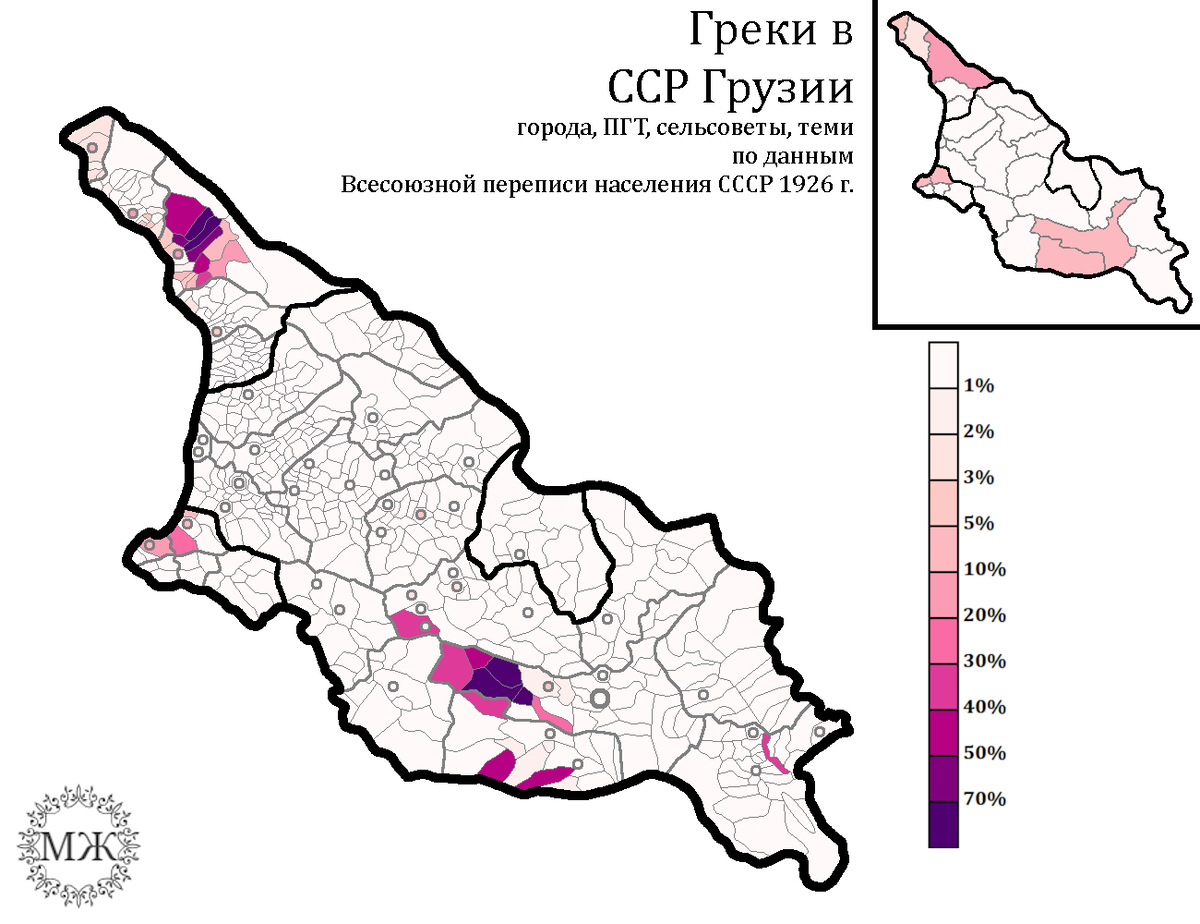Начнём с греков. Греков в Грузинской ССР на 1926 год было 54 тыс. человек или 2% от всего населения республики. Эта цифра не отражает реальность на тот момент, поскольку около 10-12 тыс. человек греческого происхождения жили в ССР Абхазии, но не обладали советским гражданством и таким образом не попали в статистический учёт. Это будет хорошо заметно при рассмотрении положения там греческого языка, поскольку в языковой статистике учитывалось уже всё население.