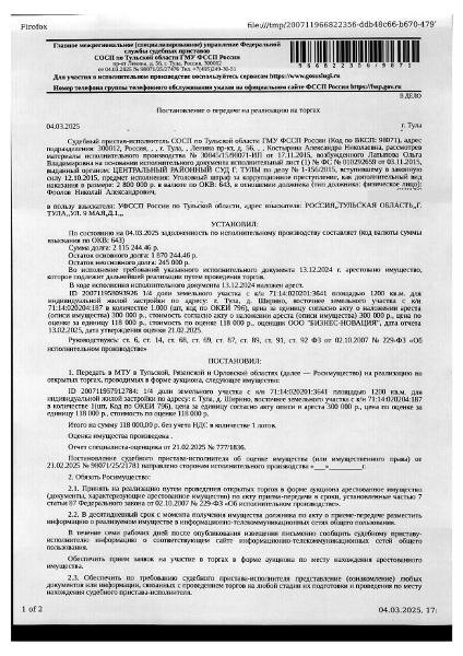 Название: 1/4 доля в праве на земельный участок, категория земель: земли населенных пунктов, виды разрешенного использования: для индивидуального жилищного строительства, площадь 1200 +/- 7,63 кв. м, кадастровый номер 71:14:020201:3641, адрес: Тульская обл, г. Тула, д. Ширино, восточнее земельного участка с кадастровым номером 71:14:020204:187 Канал: Госземля Тульская область Область: обл Тульская г. Тула Район: Центральный р-н Населенный пункт: пос. Скуратовский, пос. Матвеевские Дачи, д. 22 Локация: Смотреть на карте ВРИ: Для индивидуального жилищного строительства Кадастровый номер: 71:14:020201:3641 Кадастровая стоимость: - Вид сделки: Продажа Площадь: 1200 м² Начальная цена: 118000.00 руб. Дата завершения: 17.12.2025 Подробнее: ГИС ТОРГИ #госземля #земляотгосударства #земля #земельныйучасток #земельныеторги #торги #аукцион #продажаземли #продажа #тульскаяобласть