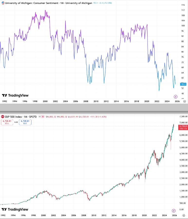 Но сегодня я вас попугаю. Чуть-чуть. Толчком стал один пост малоизвестного аналитика Бегларян. Он сравнил опрос Мичиганского университета (индекс потребительских настроений) с динамикой фондового рынка. Мне это понравилось, и я решил копнуть глубже: расширить таймфрейм и посмотреть на данные с начала 90-х до сегодняшнего дня. Получается один из самых интересных графиков, которые я видел за последние годы. Индекс потребительских настроений Мичиганского университета (тикер M