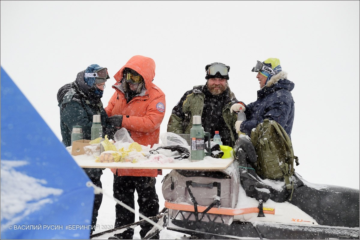 Правильно перекусить в дороге – это отдельный вид искусства, и не каждому дано правильно организовать короткий привал. В хорошей компании всегда найдется один или два человека, которые берут на себя миссию по правильной расстановке и оперативному оживлению скатерти-самобранки с походной провизией. На маршруте Беренгии скатертью-самобранкой заведовал Борисыч. Если он рядом, то всё будет опрятно, вкусно и, оч душевно. Порой откуда-то появлялось даже музыкальное сопровождение — вероятно, эльфы приходили на закуску. И вот ты стоишь такой на краю земли, на льду, и жуешь горячие колбаски под AnnenMayKantereit, думая, что лучший концерт в жизни — это именно тот, где жаренные колбаски идут в комплекте!