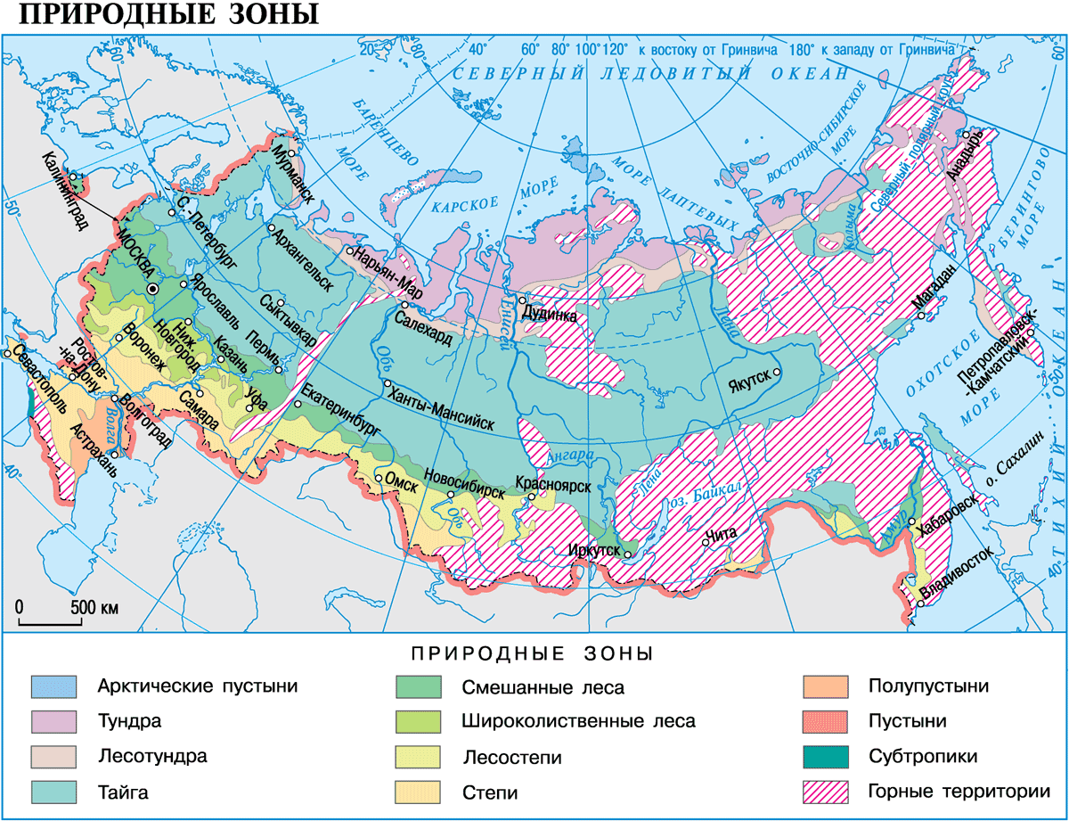 С изменением соотношения тепла и влаги при движении от полюсов к экватору меняются климатические пояса и природные зоны. Природная зона — часть географической оболочки Земли, имеющая характерные для неё особенности климата, рельефа, почвы, гидрологических условий, представителей флоры и фауны. На территории России размещаются природные зоны арктических пустынь, тундры и лесотундры, тайги, лесостепей и степей, полупустынь и пустынь, субтропиков. Арктическая пустыня — территория самой северной природной зоны страны. Она располагается в высоких широтах (севернее 70° с. ш.). В её состав входят острова арктического бассейна, покрытые мощным слоем льда: Земля Франца-Иосифа (85% территории), Северная Земля (47%), Новосибирские острова, Шпицберген и другие. В арктических водах под влиянием морских течений и силы ветра наблюдается движение льдов. Дрейфующие льды на протяжении многих десятилетий были местом научных полярных экспедиций. С 2022 г. для круглогодичного комплексного мониторинга в