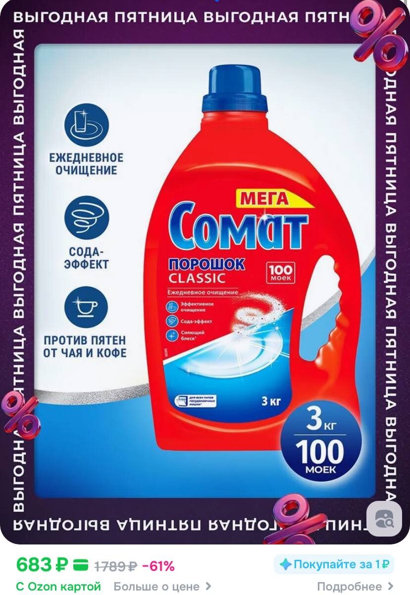 3кг (100 моек) Порошок для посудомоечной машины Сомат Классик, базовое средство для мытья посуды в посудомойке в виде порошка https://ozon.ru/t/ynIi8E4 ✅ Подписаться 🔣 Бот с промокодами