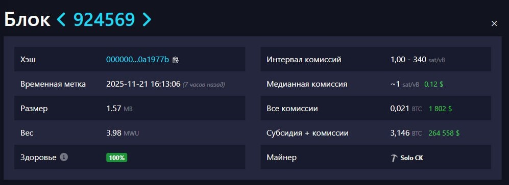 Одиночный майнер успешно добыл блок в сети Bitcoin и получил вознаграждение в размере 3.146 BTC, эквивалентное $264 000.