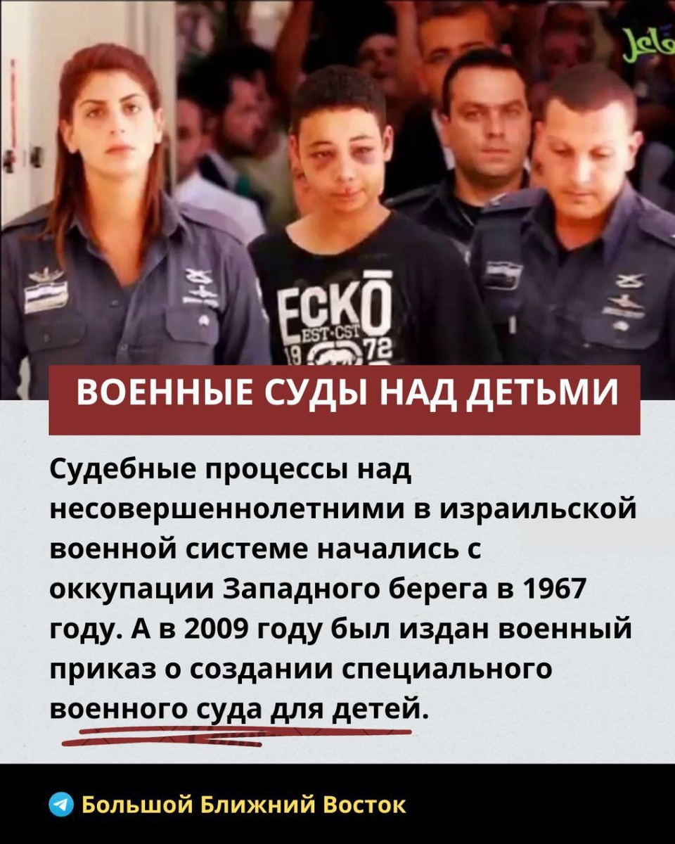 🚫Израиль - единственное государство в мире, где детей судит военный трибунал, а дети ожидают приговора много лет. Но только палестинские дети. Подробности о преступлениях израильского апартеида против детей - в карточках. 💬Israel is the only country in the world where children are tried by a military tribunal, and children have been awaiting sentencing for many years. But only Palestinian children. Details about Israeli apartheid crimes against children are in the cards.