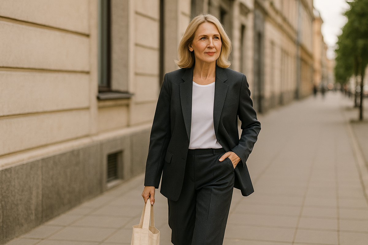 Представь: серые или графитовые брюки, белые кроссовки, светлый джемпер свободного кроя. Никакого офиса, просто аккуратная женщина, которая не живёт в джинсах 365 дней в году.
