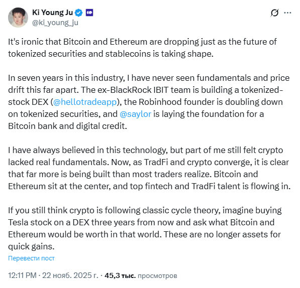 Иронично, что биткоин и эфириум падают именно в тот момент, когда начинает формироваться будущее токенизированных ценных бумаг и стейблкоинов. За семь лет в этой индустрии я никогда не видел, чтобы фундаментальные факторы и цена расходились настолько сильно. Команда бывших сотрудников BlackRock, работавшая над IBIT, сейчас строит децентрализованную биржу токенизированных акций HelloTrade, основатель Robinhood удваивает ставки на токенизированные ценные бумаги, а Сэйлор закладывает фундамент для биткоин-банка и цифрового кредита. Я всегда верил в эту технологию, но часть меня всё равно ощущала, что крипте не хватает реальных фундаментальных оснований. Теперь, когда TradFi и крипто начинают сходиться, становится ясно: создаётся гораздо больше, чем большинство трейдеров осознаёт. Биткоин и эфириум находятся в центре этого процесса, и лучшие специалисты из финтеха и традиционных финансов приходят в индустрию. Если вы всё ещё думаете, что крипта движется по классической теории циклов, пр