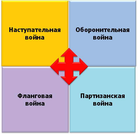 - «Наступательная война» – стратегия сильных последователей: избегание сильных сторон позиции лидера рынка и концентрация усилий на его слабых сторонах;
