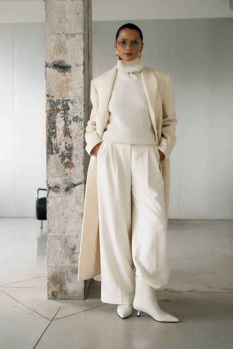 Total white образ от стилиста Kristina&Milan 🤍 Молочный тотал-лук в стиле минималистичной роскоши The Row: Структурное пальто в оттенке слоновой кости выстраивает вытянутый силуэт, а крупная вязка белого свитера с высоким горлом добавляет фактурности. За счёт игры текстур — плотной шерсти верха и гладкой костюмной ткани брюк, монохромный образ получается более интересным и многослойным. Белые ботильоны на элегантным каблуке kitten heel с широким голенищем и острым мысом вытягивают силуэт и завершают образ . Золотые украшения и очки тёплого тона дают едва заметный акцент, не нарушая целостность монохрома. Как вам такой вариант total white — носили бы или предпочитаете более контрастные сочетания?