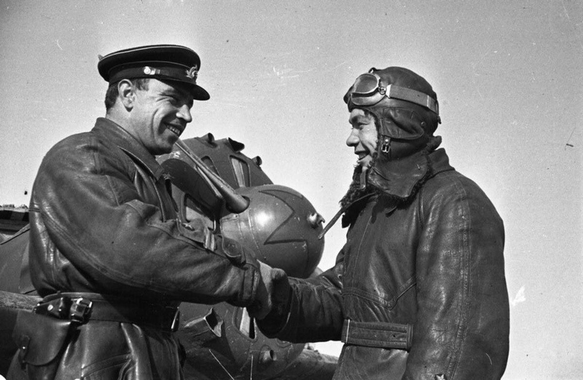 Старший лейтенант Сапрыкин Иван Иванович (слева) и лейтенант Герасимов Филипп Филиппович (справа), на фоне довольно редкого И-16 тип 29 из 6-го Гвардейского ИАП ВВС Черноморского флота; Севастополь, 7 апреля 1942 года. Этот истребитель нёс только синхронное вооружение - два ШКАСа над двигателем и один УБС под ним. На фото хорошо видно как для установки крупнокалиберного УБС под двигателем, маслорадиатор сместили от оси симметрии и перенесли в пространство между четвертым и пятым цилиндрами двигателя. На пределе🔥