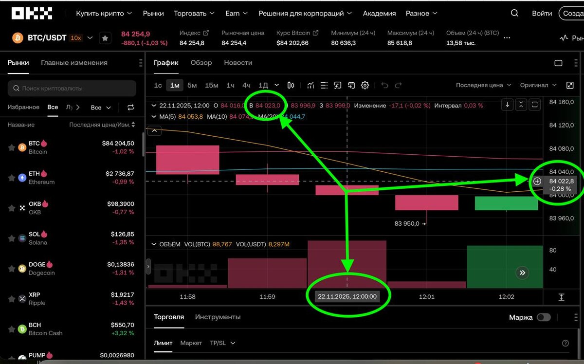 В ответ на пост Определяем победителя конкурса на курс BTC. Максимальная цена определяется по верхней тени свечи, она же является самой высокой точкой и указывает на максимальную цену за заданный период. Исходя из вышесказанного курс BTC на бирже OKX сегодня в 12:00 по МСК на минутной свече был равен $84,023. Иду в чат искать победителя)