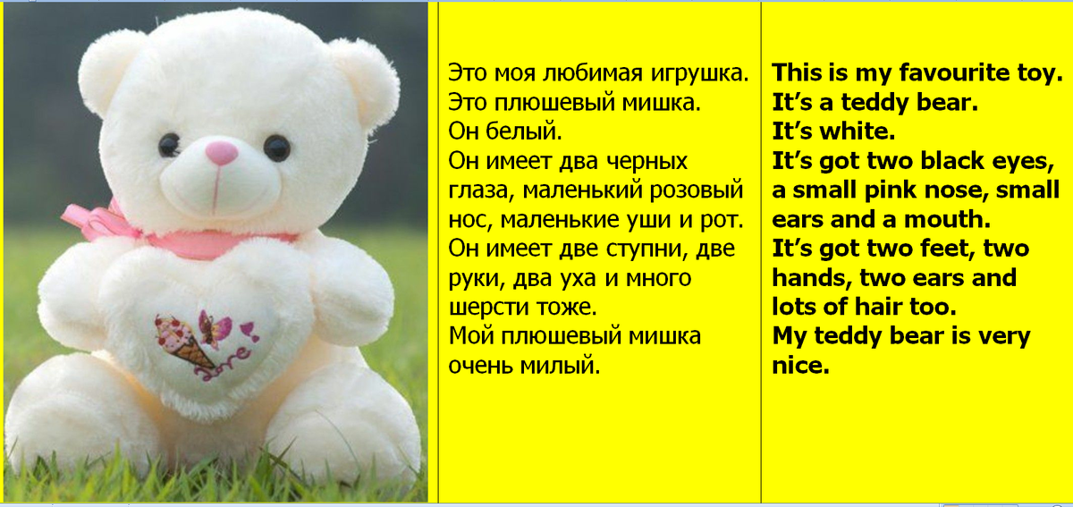 А сейчас более подробно. Итак: Это моя любимая игрушка. This is my favourite toy. (Если в предложении на русском языке нет глагола, то в английском глагол должен быть обязательно. Здесь This указательное местоимение и с ним идёт глагол to be - is.) Это плюшевый мишка. It’s a teddy bear. (Здесь местоимение it, которое в данном случае заменяет русское это. Так же видим, что в предложении снова нет глагола, С it всегда ставим глагол to be - is. И перед существительным в единственном числе нужен артикль, в данном предложении это ‘‘а’’) Он белый. It’s white. (Здесь местоимение it заменяет «a teddy bear». Так же видим, что в предложении снова нет глагола, с it всегда ставим глагол to be - is.) Он имеет два черных глаза, маленький розовый нос, маленькие уши и рот. It’s got two black eyes, a small pink nose, small ears and a mouth. (Здесь ставим местоимение it снова заменяет «a teddy bear», так как «a teddy bear» – это предмет, игрушка. Сокращенная форма «‘s got = has got», т.е. иметь. Перед