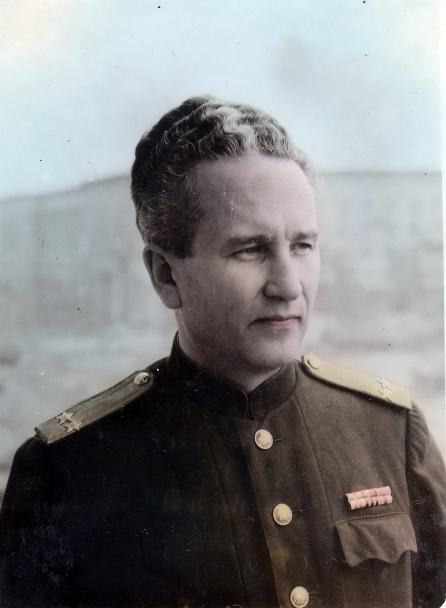 Подполковник административной службы в закрытом шерстяном кителе со съемными повседневными узкими погонами образца 1946 года. Фотография раскрашена анилиновыми красителями. Источник: отсканированная фотография из личной коллекции. #фото #Советская_армия #подполковник #офицер