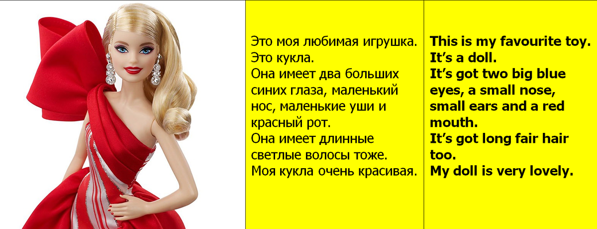 А сейчас более подробно. Итак: Это моя любимая игрушка. This is my favourite toy. (Если в предложении на русском языке нет глагола, то в английском глагол должен быть обязательно. Здесь This указательное местоимение и с ним идёт глагол to be - is.) Это кукла. It’s a doll. (Здесь местоимение it, которое в данном случае заменяет русское это. Так же видим, что в предложении снова нет глагола, С it всегда ставим глагол to be - is. И перед существительным в единственном числе нужен артикль, в данном предложении это ‘‘а’’) Она имеет два больших синих глаза, маленький нос, маленькие уши и красный рот. It’s got two big blue eyes, a small nose, small ears and a red mouth. (Здесь ставим местоимение it, которое в данном случае заменяем слово doll, так как doll – кукла это предмет. Сокращенная форма ‘s got = has got, т.е. иметь. Перед big blue eyes и small ears нет артикля, т.к. это множественное число, а вот перед small nose и red mouth нужен артикль а, т.к. здесь существительные в единственном