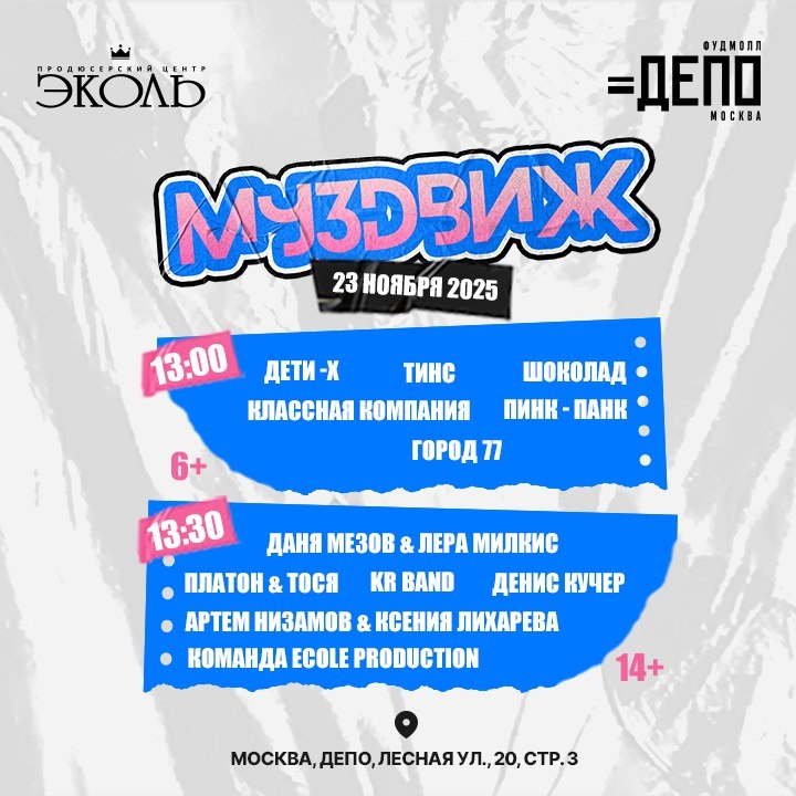 🗓️23 ноября 2025 года Концерт артистов продюсерского центра «Эколь» На сцене фудмолла «Депо.Москва» со своей яркой программой «МузДвиж» выступят артисты продюсерского центра «Эколь». «Эколь» – это платформа для творческих детей и подростков. Здесь юные исполнители готовятся к выступлениям и съёмкам, а также получают поддержку в продюсировании. Воспитанники центра на протяжении многих лет активно участвуют в самых известных телевизионных шоу и фестивалях, таких как «Голос дети», «Новая волна», «Синяя птица». В качестве хэдлайнеров проекта «Поколение М» артисты уже дали концерты в 30 городах страны. Выпускники успешно сотрудничают с известными музыкальными лейблами. Уже по традиции ребята зажгут на сцене фудмолла со своими авторскими хитами и каверами на известных исполнителей. Ждём всех на зажигательном выступлении юных талантов! 🕗 Сбор гостей: 13:00 🗺️ Местоположение: Депо на Лесной 💰 Вход свободный Не забудь поделиться с другом/подругой чтобы пойти вместе 🫶 #концерт #муз