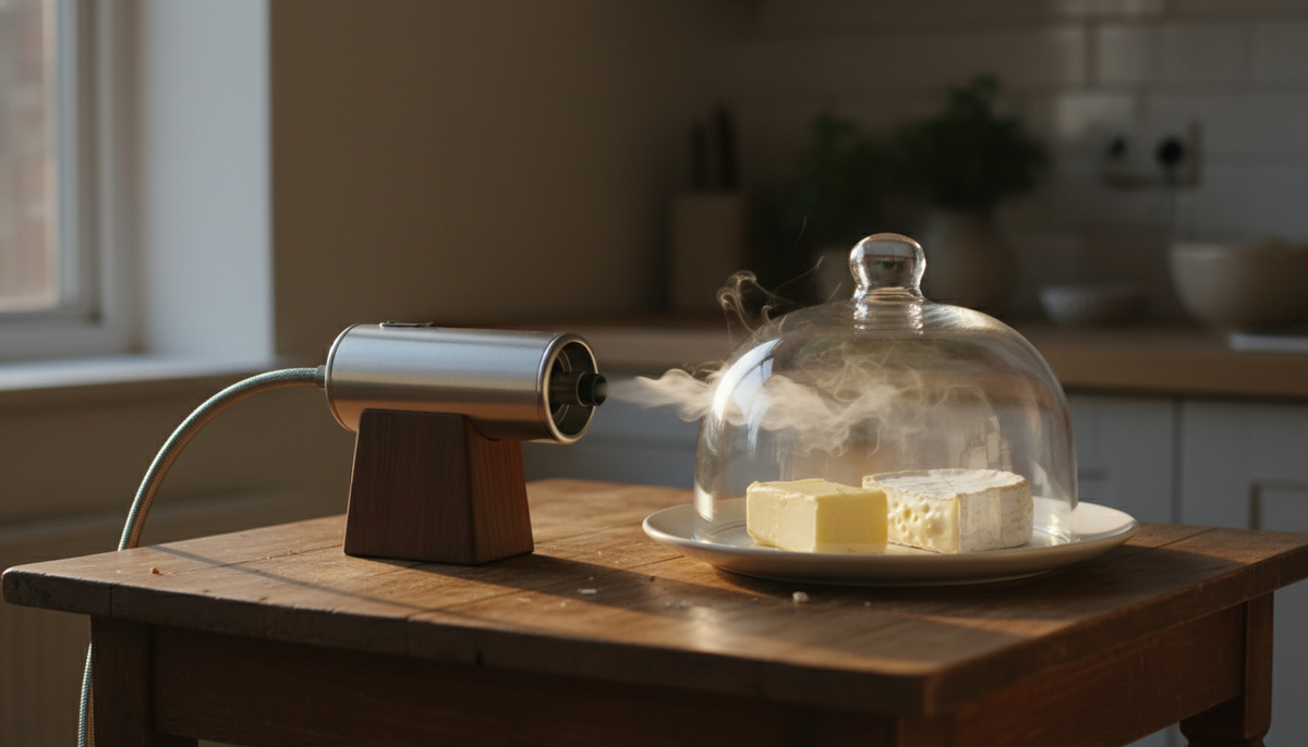 - Что нужно: smoking gun, стеклянный купол или большая миска, пищевой продукт, щепа (яблоня, ольха), окно/вытяжка.