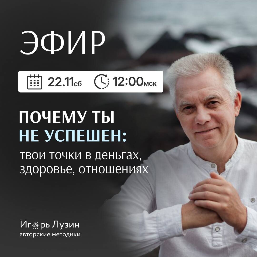 Ко мне часто приходят люди, которые годами пытаются изменить жизнь, но продолжают наступать на одни и те же грабли: 💰 Деньги утекают сквозь пальцы, хотя вы много работаете 🤧 Здоровье напоминает о себе хронической усталостью 💔 Отношения оставляют ощущение непонимания и одиночества Если вы узнаёте себя, жду вас 22 ноября в 12:00 (МСК) на эфире: «Почему ты не успешен: твои точки в деньгах, здоровье, отношениях». Что будет на эфире: ✅ Разберём корневые причины повторяющихся проблем ✅ Поймете, как внутренние блоки создают внешние обстоятельства ✅ Получите практические инструменты для изменений ЗАРЕГИСТРИРОВАТЬСЯ НА ЭФИР https://t.me/IgorLuzin_Bot?start=efir_2211_dzen
