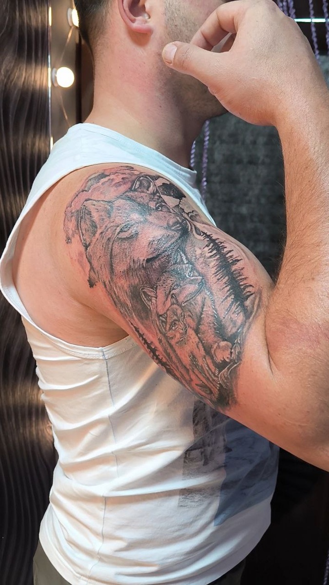 🐺 Сила мужчины — в тех, кого он защищает. Сегодня на плече моего гостя появилась татуировка, в которой каждый элемент — про семью и внутренний стержень. Главный волк — он сам. Уверенный, спокойный, смотрящий вперёд. Тот, кто ведёт, кто держит удар, кто стоит первым. А два младших волка под ним — его жена и сын. Стая, которую он бережёт, поддерживает и любит. Символ того, что рядом с сильным мужчиной всегда есть те, ради кого он становится ещё сильнее. Графика получилась объёмной, выразительной, с мягкими переходами и атмосферой леса. Тату идеально легла на плечо и подчёркивает характер своего хозяина. 🔥 Спасибо за доверие — такие работы всегда особенно трогают. Если хочешь тату со смыслом, которая говорит за тебя — пиши 💬 #тату #мужскаятату #волки #татуволк #семейнаятату #татусмыслом #tattoo #wolfpack #kleinksenia #татуграфика #татуплечо 📍 Адрес: г. Туапсе, ул. Привокзальная площадь, д. 5 📞 Телефон: +79881891818 💬 Телеграм: @KleinKsenia 🙌 Ваш мастер: Клейн Ксения