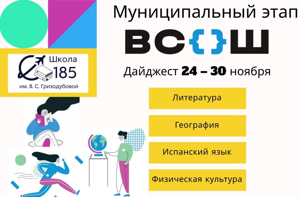 На следующей неделе муниципальный этап Всероссийской олимпиады школьников пройдет по четырем предметам. Публикуем дайджест с 24 по 30 ноября. ✔️Литература 24 ноября 9-11 классы примут участие в муниципальном этапе по литературе. Начало в 16.00. 7-8 классы приступят к работе 25 ноября с 16.00. ✔️География Муниципальный этап по географии для 7-11 классов пройдет 26 ноября, начало в 16.00. ✔️Испанский язык 27 ноября пройдет муниципальный этап по испанскому языку для 7-11 классов. Начало в 16.00. ✔️Физическая культура Практический тур муниципального этапа по физической культуре пройдет 29 и 30 ноября для 7-11 классов, начало в 9.00. #ДОНМ #ШколыКолледжиМосквы #Школа185 #САО