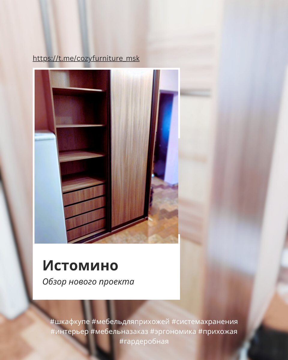 Рассказываем о проекте, который реализовали для Марины из Истомино — эргономичный шкаф-купе, решивший проблему хранения в небольшой прихожей. Раздвижные двери — оптимальное решение для прихожих, где каждый сантиметр на счету. В отличие от распашных конструкций, они: - Экономят до 1 м² пространства - Не мешают свободному перемещению - Выглядят современно и стильно Продуманное наполнение В основе проекта — принцип "всё на своих местах": Верхняя зона - Две полноразмерные штанги для пальто, курток, плащей Нижняя зона - Четыре вместительных ящика с системой скрытого монтажа - Плавные доводчики для бесшумной работы - Фасады с фигурной фрезеровкой "улыбка" Материалы: - Корпус: ЛДСП "Увадрев Ясень шимо" темный - Фурнитура: бронзовый профиль - Система: раздвижные двери с нижней направляющей Размеры: - Ширина: 2600 мм - Высота: 2400 мм - Глубина: 600 мм Стоимость: 84 000 рублей (под ключ) Эта конфигурация идеальна для: - Семей с детьми (много одежды и обуви) - Компактных прихожих - Людей, ценящи