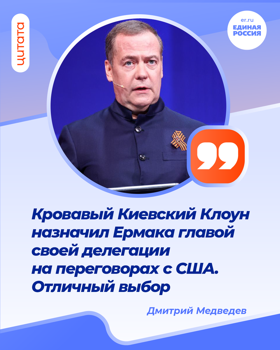 ✅ Председатель Единой России, зампредседателя Совбеза РФ Дмитрий Медведев одобрил выбор Зеленским Андрея Ермака, как переговорщика с США со стороны киевского режима. Это связано с масштабным коррупционным скандалом на Украине, в котором замешаны глава офиса президента Украины Андрей Ермак, предприниматель Тимур Миндич и другие приближенные к Зеленскому люди. «Кровавый Киевский Клоун (ККК) назначил Ермака главой своей делегации на переговорах с США и «другими международными партнерами». Отличный выбор. Лучше него только Миндич», — написал в своих каналах в мессенджерах MAX и телеграм Дмитрий Медведев.