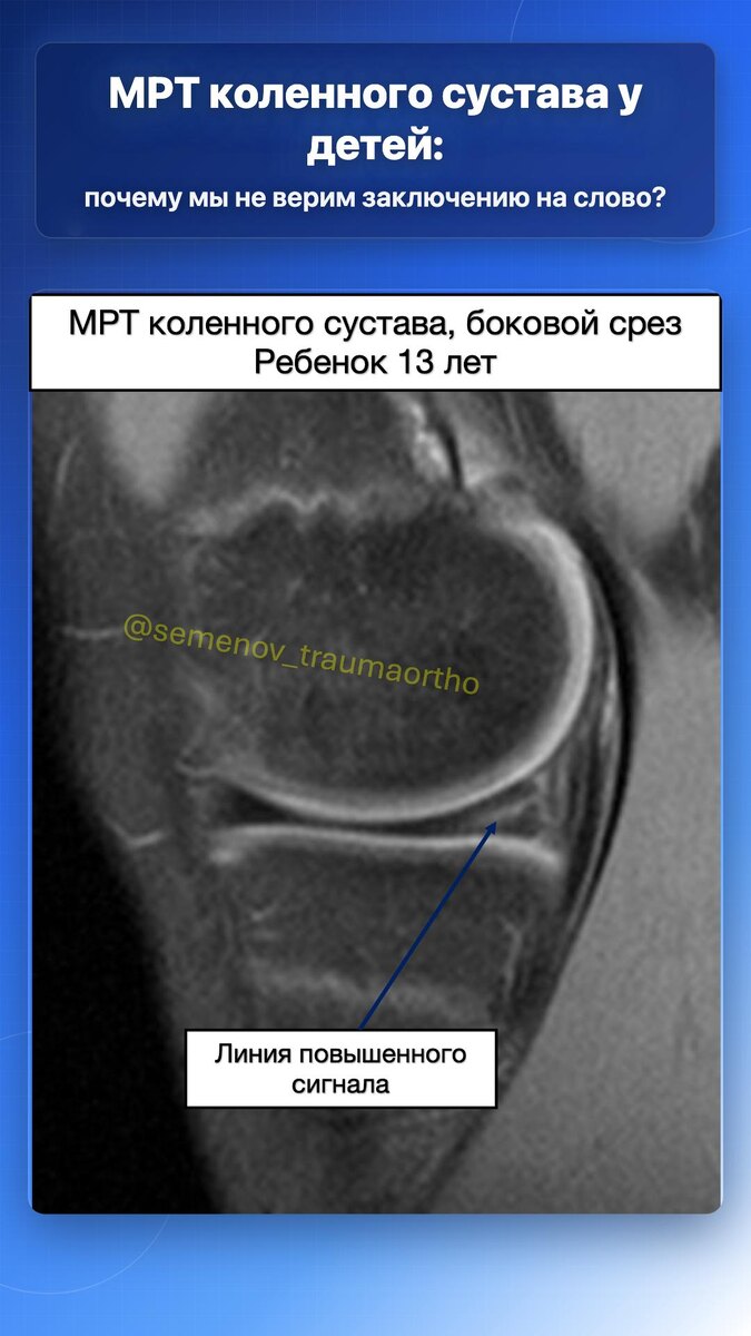 ➡️На МРТ разрыв мениска, а в реальности его нет - почему так? #спортивная_травма 👋Привет, друзья! На связи Андрей Семенов. 👨⚕️ 🔜 В детской травматологии мы часто сталкиваемся с парадоксом: на снимках МРТ описан разрыв, а клинически колено болит в ДРУГОМ месте и наводит на мысль о другой патологии. 🤯 Почему так происходит? ✏️ Корень проблемы — в физиологии. У взрослых мениск кровоснабжается только по самому краю. У детей же, особенно до 10–12 лет, сосудистая сеть пронизывает почти всю толщу ткани. 🟡 На МРТ эти сосуды дают гиперинтенсивный сигнал, который часто интерпретируется как повреждение. 📉 Что говорит наука? 1️⃣ Высокий риск гипердиагностики. 🔜 Японское исследование показало: у 80% абсолютно бессимптомных 10-летних детей на МРТ обнаруживается сигнал, похожий на повреждение. 🟡 К 15 годам частота таких находок снижается до 35%, так как сосуды регрессируют естественным образом. (Takeda et al., 2002; DOI: 10.1016/s0736-0266(01)00161-6) 2️⃣ Возраст имеет значение. 🔜