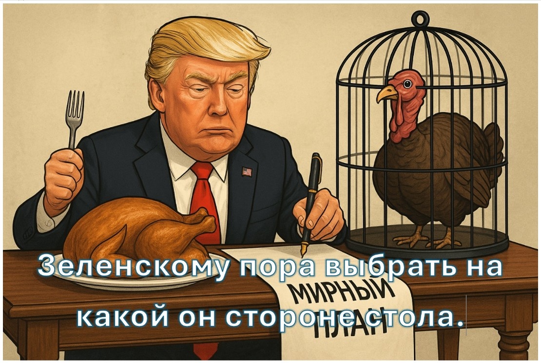 В Вашингтоне ожидают от Зеленского согласия до 27 ноября. А это — День благодарения. Традиция проста: президент США торжественно помилует одну индейку, а вторая отправляется на праздничный стол.