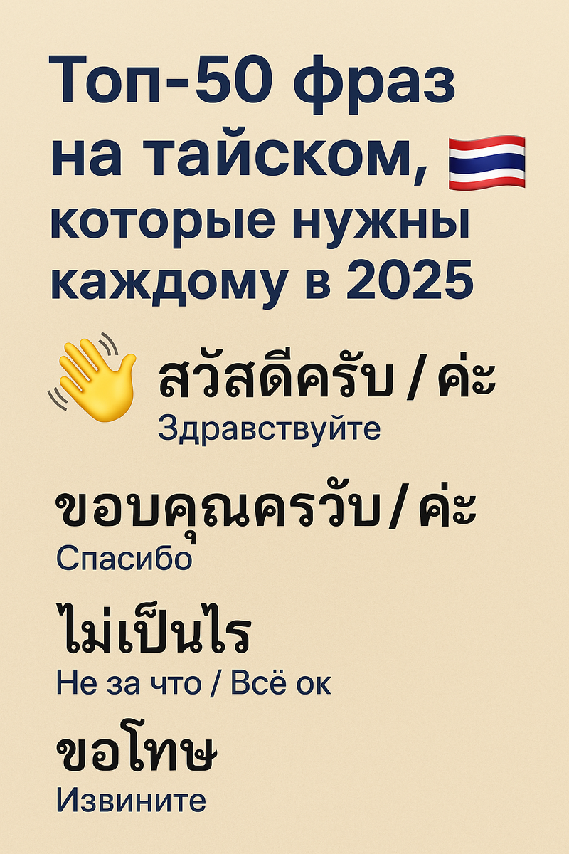 Если вы живёте в Таиланде, путешествуете или делаете виза-ран — знание базовых фраз на тайском меняет всё. Сервис лучше, цены ниже, улыбок больше 😊 Собрал 50 самых нужных выражений, которыми реально пользуются местные и экспаты. 🎉 Хотите подборку аудио-произношений этих фраз и PDF-шпаргалку? Напишите «Хочу PDF» — отправлю версию для телефона и виза-ранов!