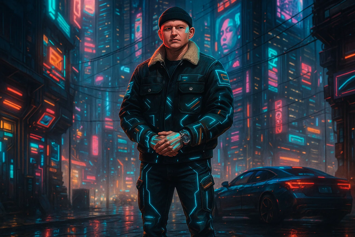 На фото — мужчина, облачённый в чёрную куртку с меховым воротником, брутальную шапку-бини, стильные часы и уверенное выражение лица. Но он не просто персонаж повседневности. В атмосфере киберпанка вокруг него сверкают неоновые огни, небоскрёбы утыканными многочисленными экранами, а на самой куртке проступают светящиеся полосы — словно это электросхема, опоясывающая тело человека будущего.