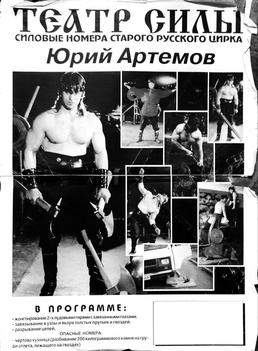 - чёртова кузница, разбивание на груди атлета лежащего голой спиной на гвоздях камня и многие другие трюки. На фото представлены афиши "Театра Силы" 1990 и 1998 года.