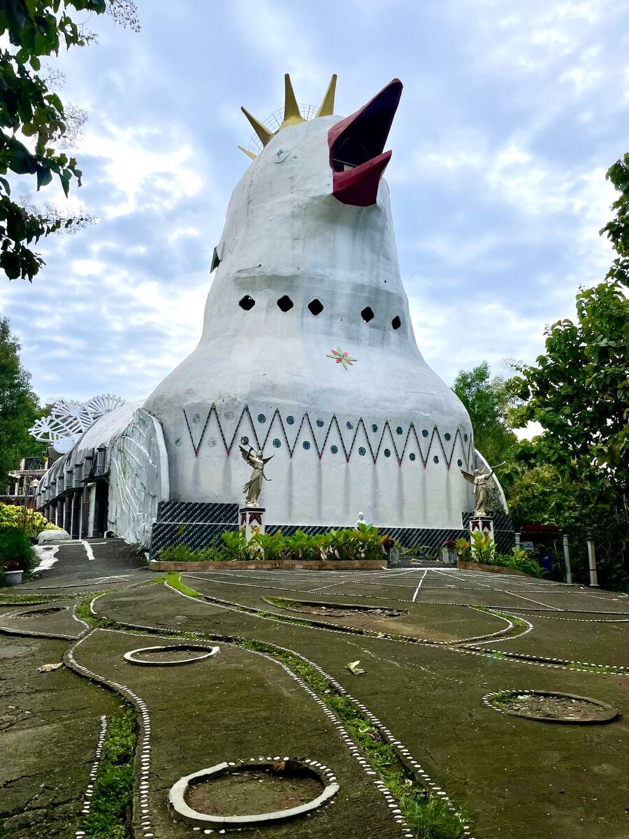 Одно из самых странных мест, где мне довелось побывать в этом году — Гереджа Аям или Храм гигантской курицы на острове Ява. Хотя авторы задумывали постройку в форме голубя мира, получилась у них натурально курица — и с мнением общественности решили не спорить, официально переименовав здание в Куриную церковь. Церковь эта появилась благодаря сну, приснившемуся одному местному жителю в конце 1980-х годов. Во сне он увидел белого голубя, порхающего на вершине горы, принял это за знак свыше и взялся за дело. Неподалёку от города Боробудур был найден подходящий холм — и началось строительство. Но деньги быстро закончились, голубь в руках неумелых строителей принял форму облезлой курицы, и недостроенный храм был вскоре отдан на растерзание джунглям. Однако о необычной локации прознали местные киношники, решив, что она будет идеальным фоном для индонезийских мыльных опер, за ними подтянулись свадебные процессии, а в 2015 году сюда приехал немецкий режиссёр Вернер Херцог для съемок документа